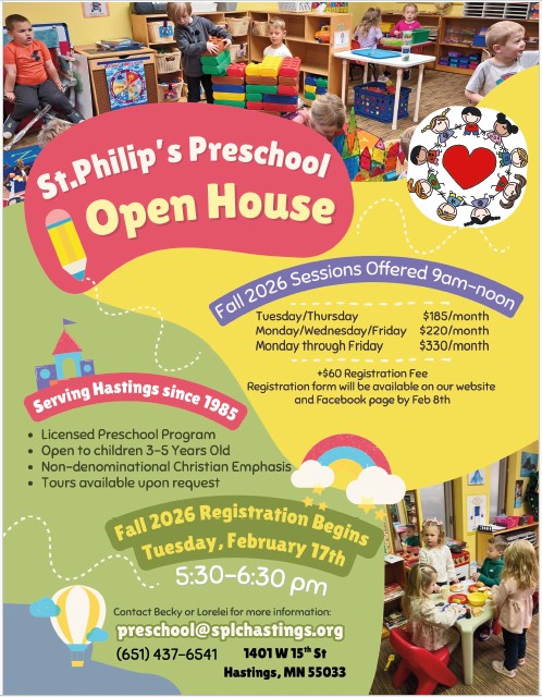 We are a non-denominational Christian preschool serving the families of Hastings, Minnesota. We provide families with a warm and nurturing Christian environment where we strive to help each child reach their individual potential in all areas of development and school readiness. We offer multiple class options with one qualified teacher and one assistant working with a group of up to 16 children.